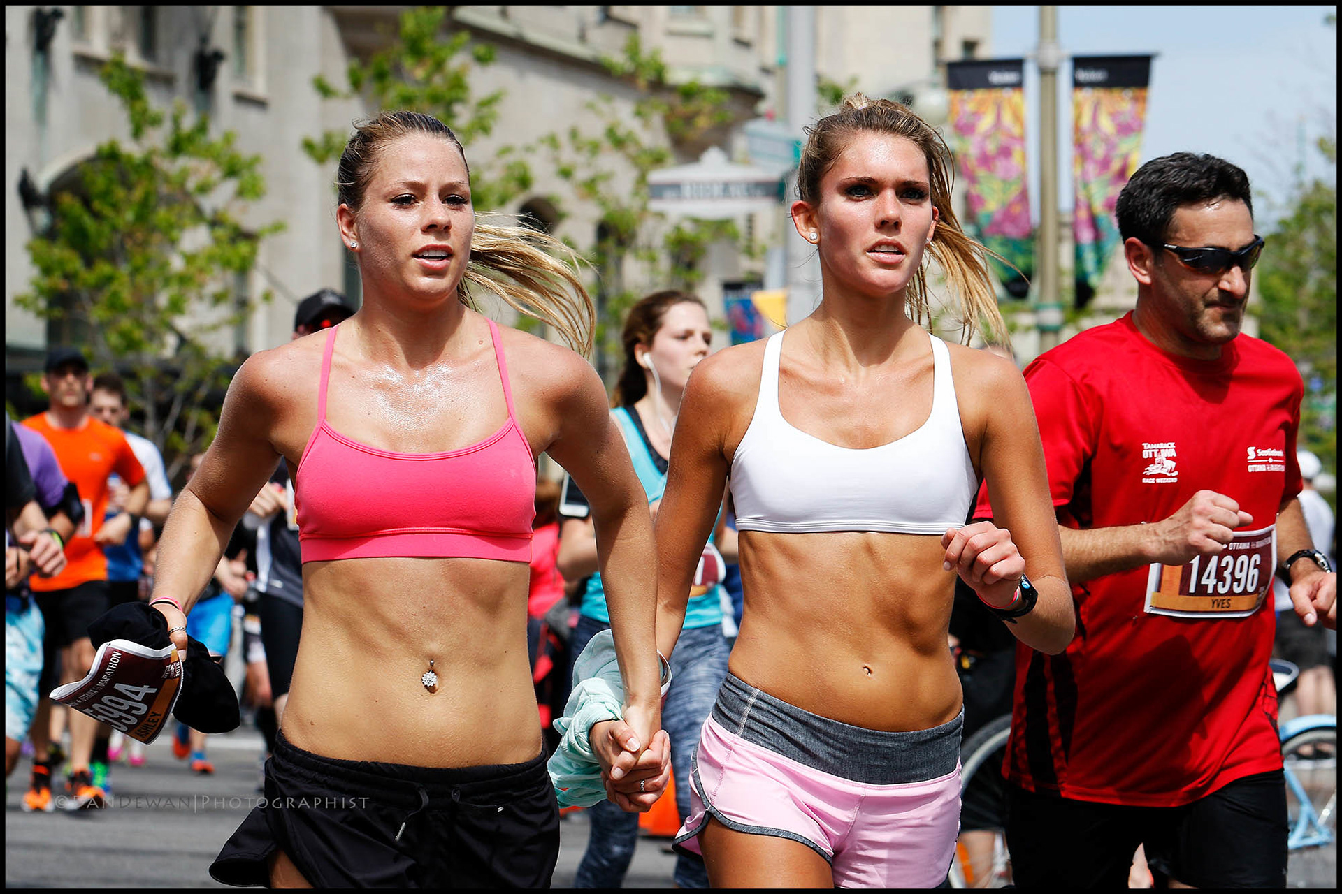 Runners Ashley and her friend hold on as they run the 1/2 marathon on Sunday May 23.