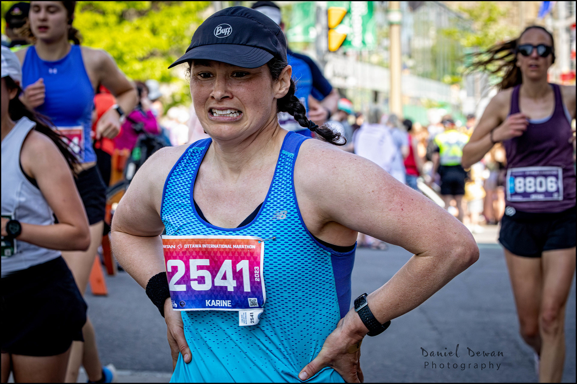 Karine feels the pain while she runs in the Ottawa International Marathon on Sunday May 28 2023.