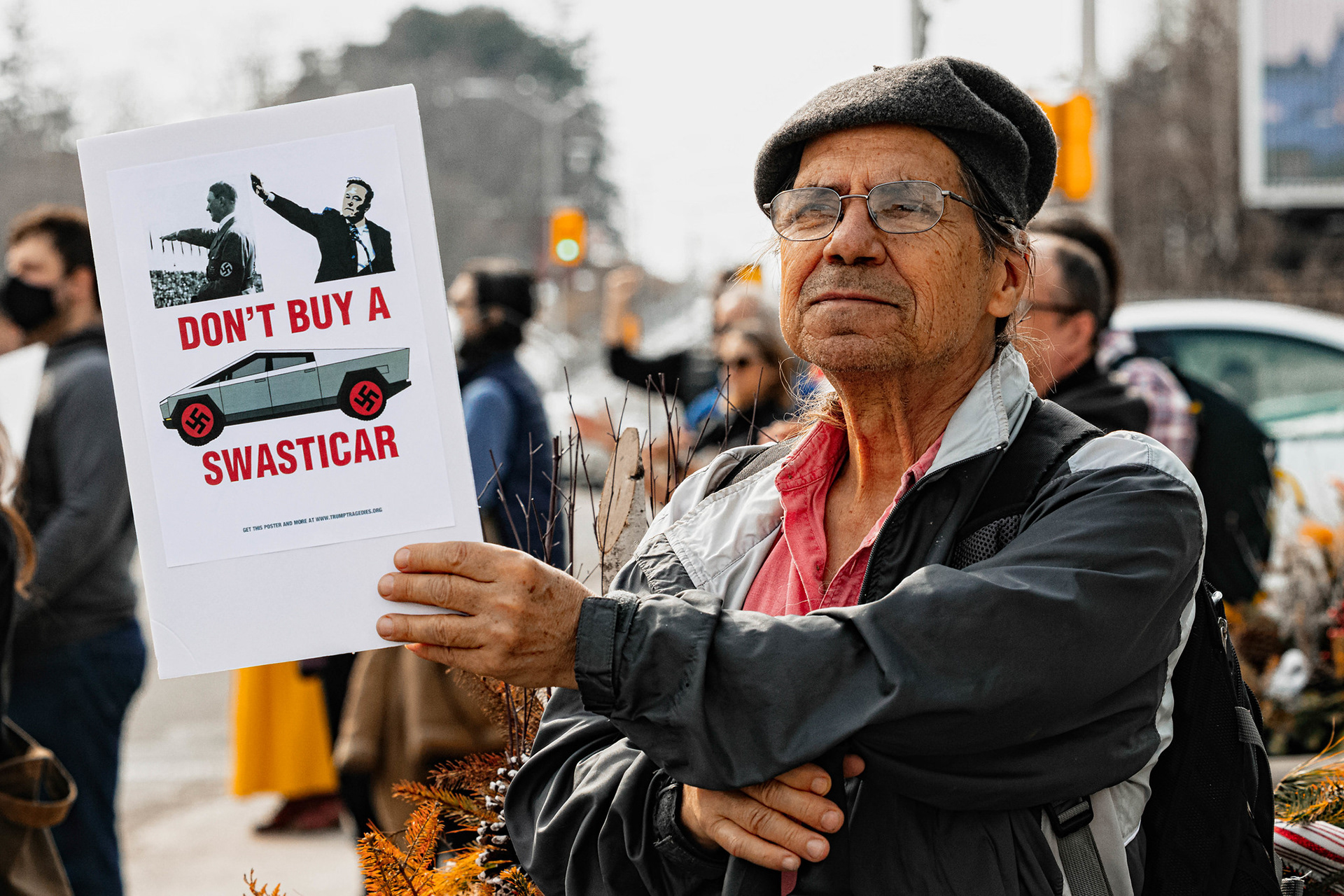"Don't Buy A Swasticar" A man protests Elon Musk outside a Tesla dealer on Carling Avenue in Ottawa. The protesters recieved plenty of horn honking support from the traffic passing by. Saturday March 15 2025.