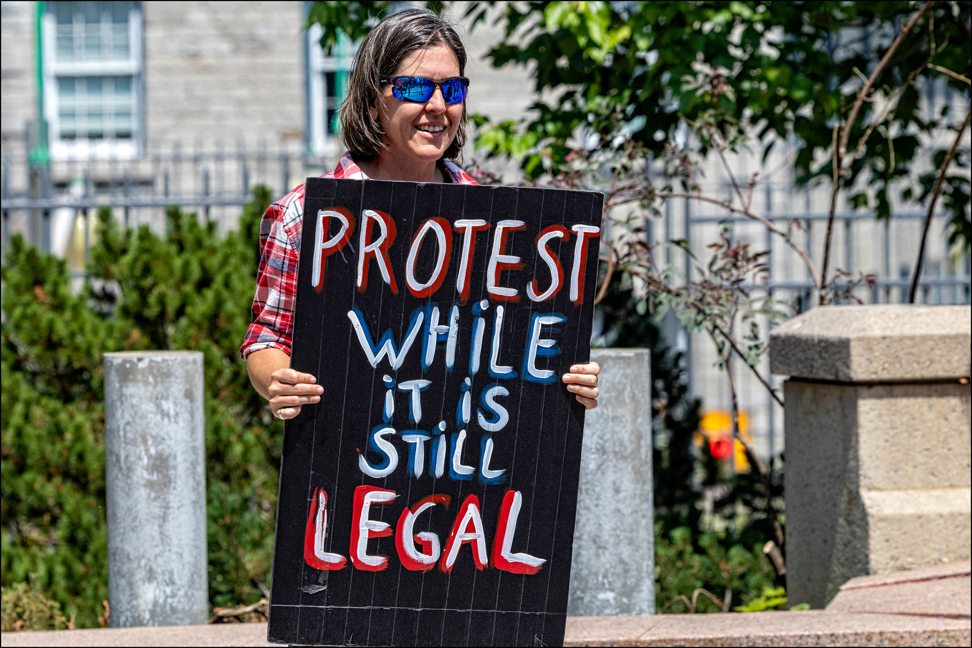 Protester outside the U.S. Embassy on MacKenzie Avenue in Ottawa. Saturday June 14 2025.