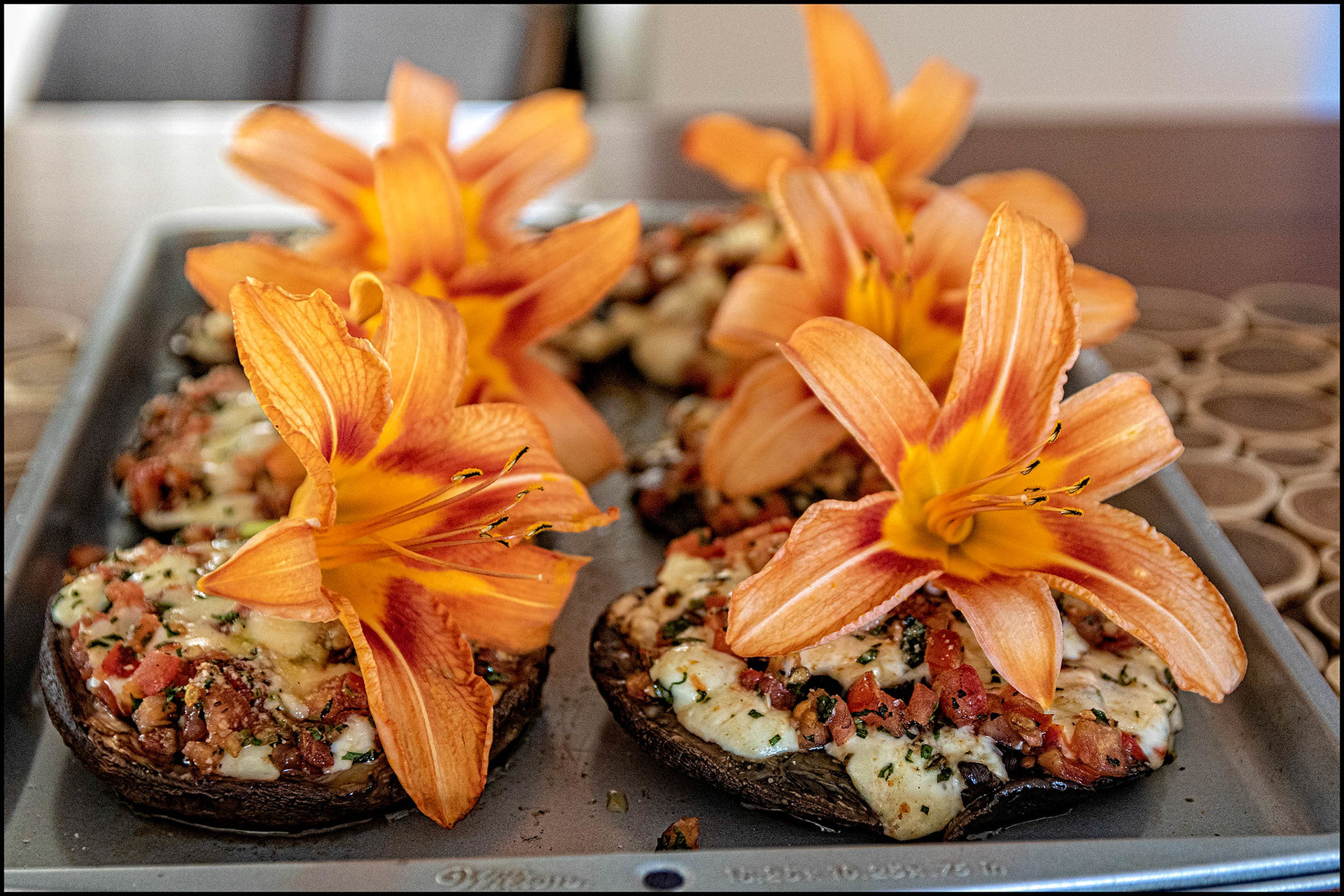Portabello Mushrooms with Day Lillies. July 22 2019.