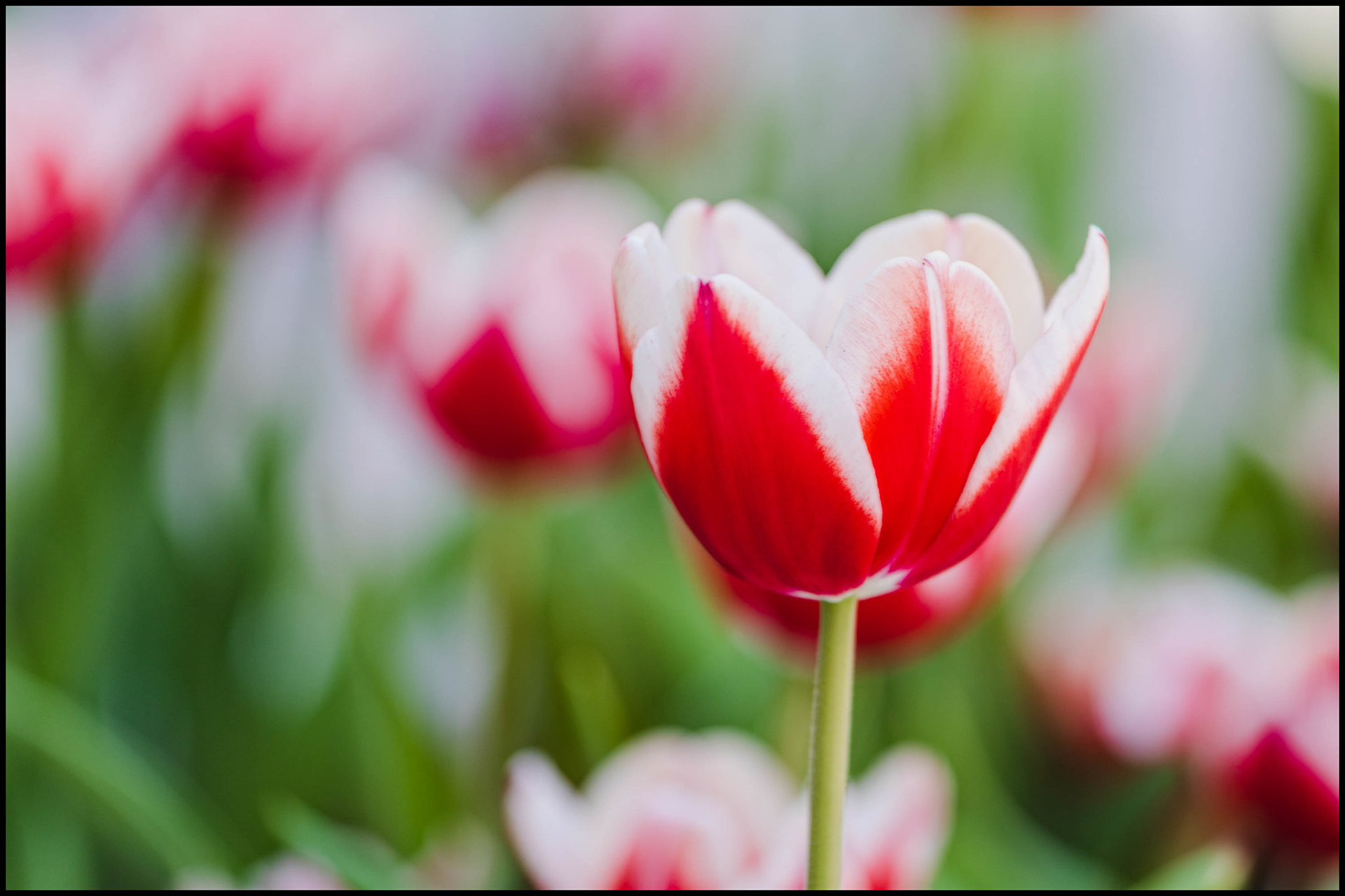 Red & White Tulip on Sparks Street Mall in Ottawa. May 24 2020.