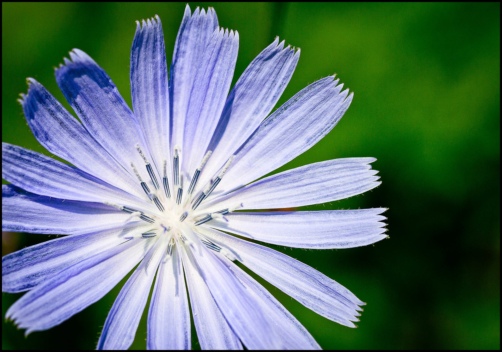 Chicory flowers from June to October. Only a few flower heads open at a time and each lasts only a day. The roots can be roasted and ground as a coffee substitute or additive. August 1 2014.